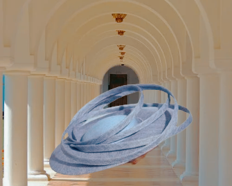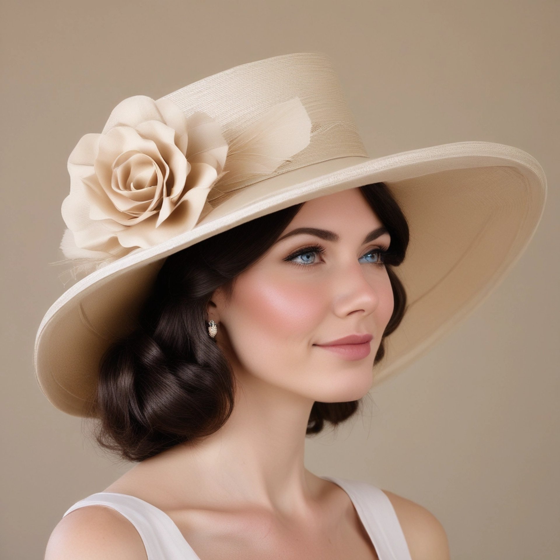 Um chapéu um toucado, uma flor, um acessório, um vestido
